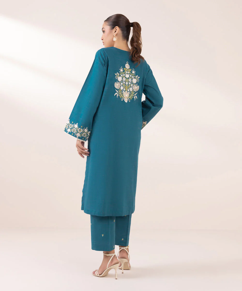 Make a solid statement this season in our embroidered teal A-line textured cotton shirt featuring a round neckline with slit.
