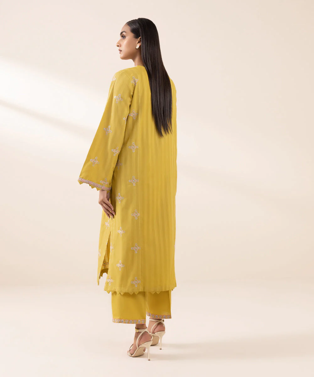 Keep it easy breezy in our yellow mustard, straight dobby shirt with sequins and embroidery.