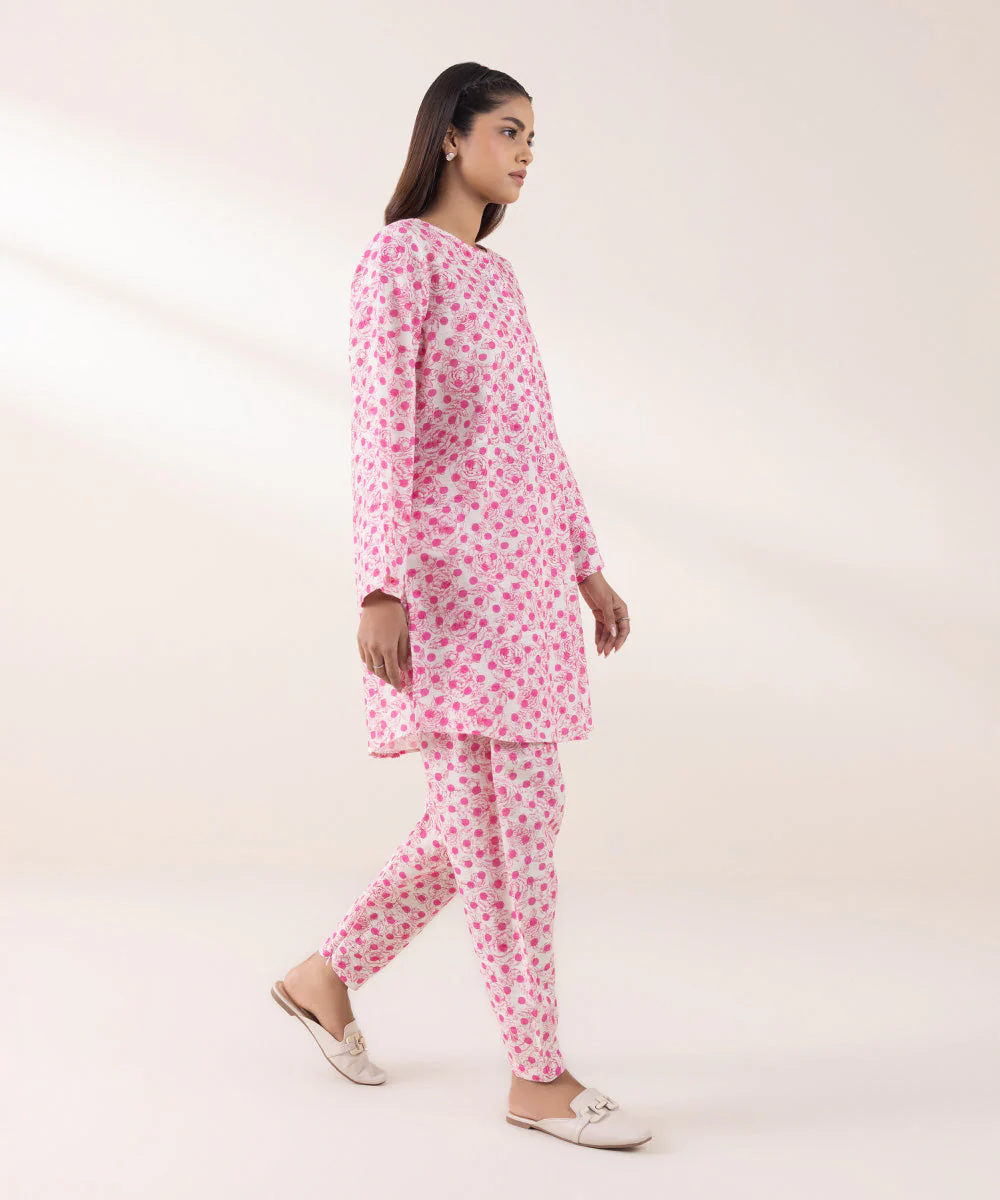 Spruce up your winter closet with our printed pink and white A-line light khaddar shirt featuring a round neckline with placket.